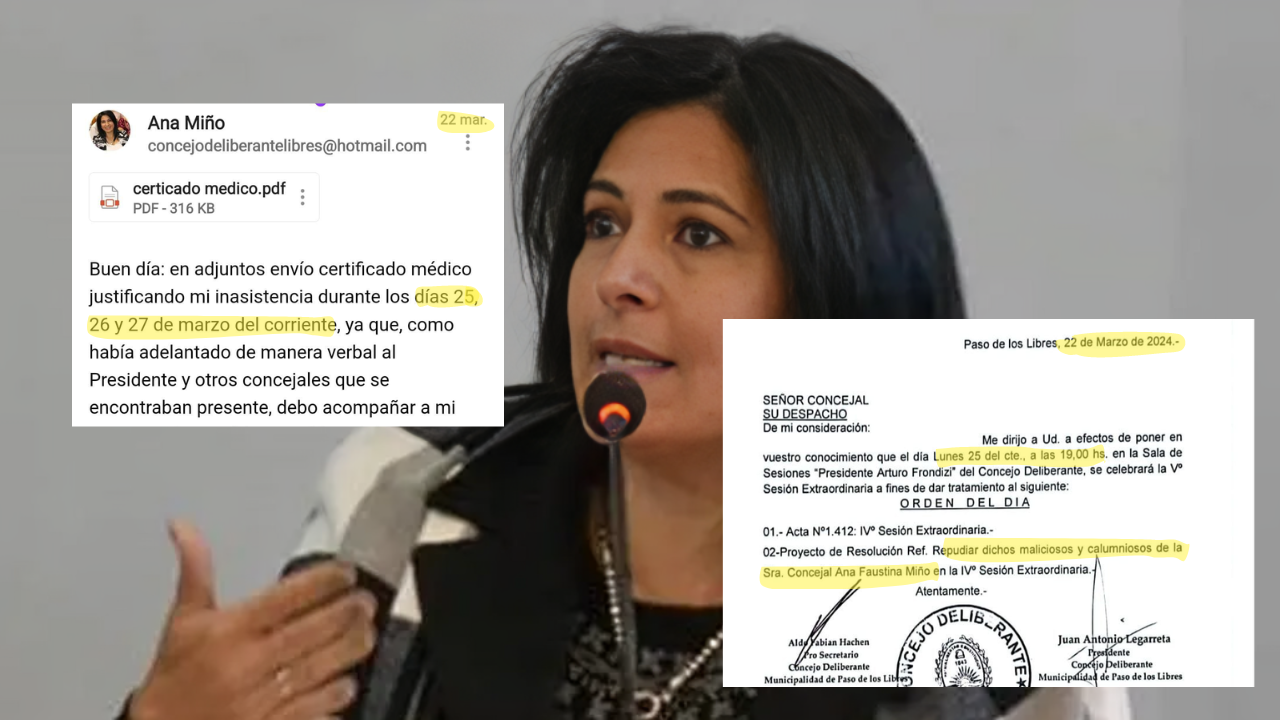 ¿Cuál es la polémica? Ana Miño, en aquella sesión, ya había expresado que no iba a encontrarse en la ciudad por cuestiones personales. La postura del bloque de ECO + Vamos Corrientes es firme en que este tipo de descargos no se pueden realizar sin la persona a la que están haciendo mención.
