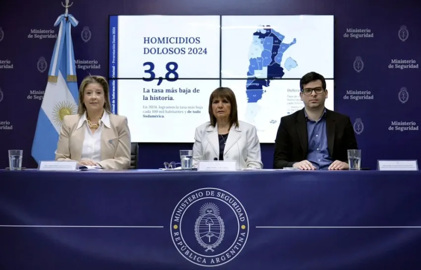 La ministra de Seguridad de la Nación, Patricia Bullrich, anunció este martes que Argentina alcanzó en 2024 la tasa de homicidios dolosos más baja desde que se tienen registros, según datos del Sistema Nacional de Información Criminal (SNIC). El índice fue de 3,8 cada 100.000 habitantes, una cifra que, además, ubica al país —según la ministra— como el de menor tasa de homicidios en toda Sudamérica.