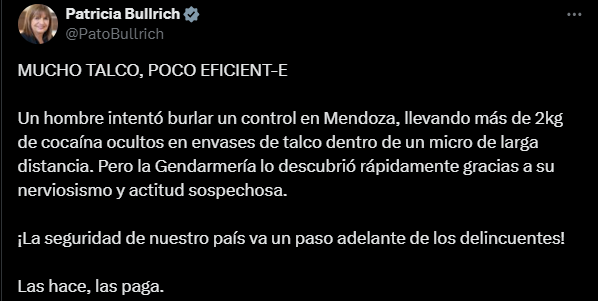 El 6 de octubre pasado, Bullrich publicó un mensaje en su cuenta de X titulado «MUCHO TALCO, POCO EFICIENT-E», celebrando la incautación de 2 kilos de cocaína, supuestamente ocultos en envases de talco, por parte de la Gendarmería Nacional.