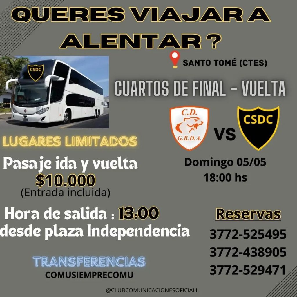 En sus redes sociales, el club libreño comunicó que tiene lugares disponibles para las personas de Paso de los Libres que deseen ir a ver el encuentro a la localidad santotomeña. El viaje cuesta 10 mil pesos e incluye pasajes de ida y vuelta y también la entrada al estadio 27 de Agosto. El colectivo saldrá ese mismo día, a las 13 horas, desde Plaza Independencia.