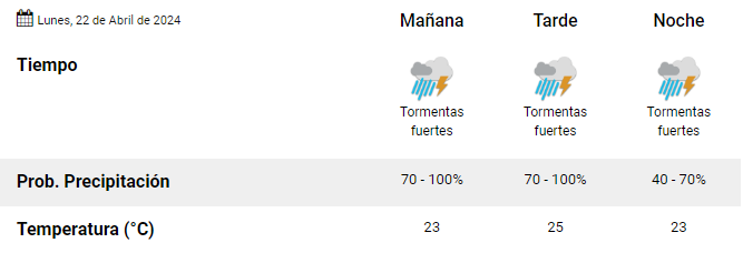 La temperatura mínima esperada es de 21°C y la máxima de 25°C. La humedad es del 95% y el viento sopla desde el este a 33 km/h.