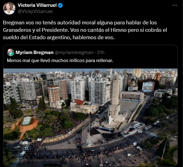 La titular del Senado, Villarruel, no tardó en responder a la publicación de Bregman: «Bregman vos no tenés autoridad moral alguna para hablar de los Granaderos y el Presidente. Vos no cantás el Himno pero si cobrás el sueldo del Estado argentino, hablemos de vos«.